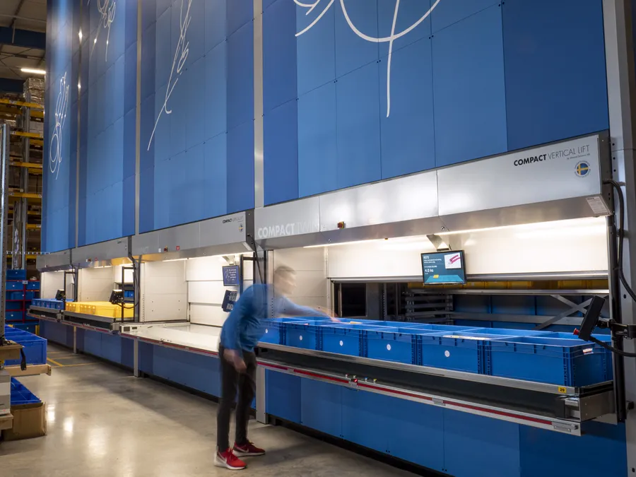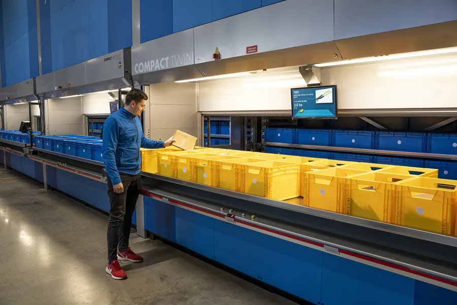 The vertical stackers are complemented by a picking rack working on the principle of Pick-to-Light technology. Colour- coded confirmation buttons and colour selection allow multi- ple operators to work simultaneously in the picking zone. This system allows for an increase in the number of picked orders.